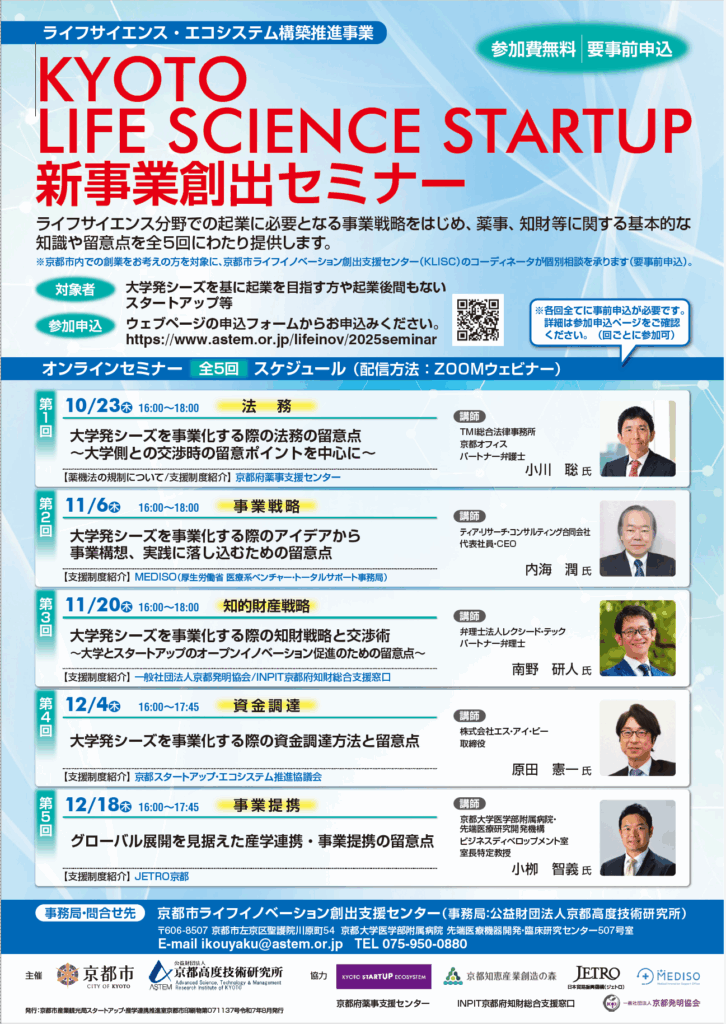 弁理士 南野 研人が、2025年11月20日に、京都高度技術研究所(ASTEM)主催のフォーラム「KYOTO LIFE SCIENCE STARTUP 新事業創出セミナー」の第3回で講師を務めます。