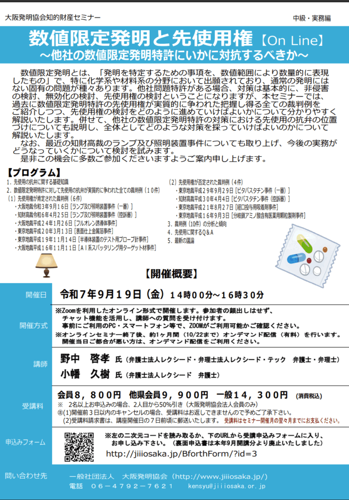 弁護士・弁理士 野中 啓孝と、弁護士 小幡 久樹が、2025年9月19日(金)に、大阪発明協会主催の知的財産セミナーで講師を務めます。